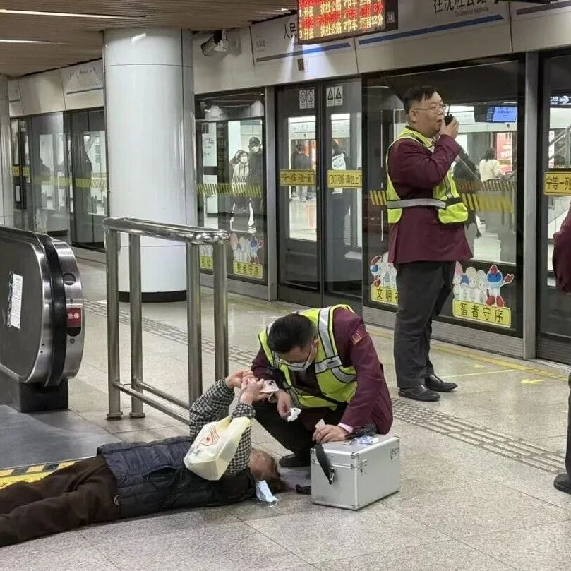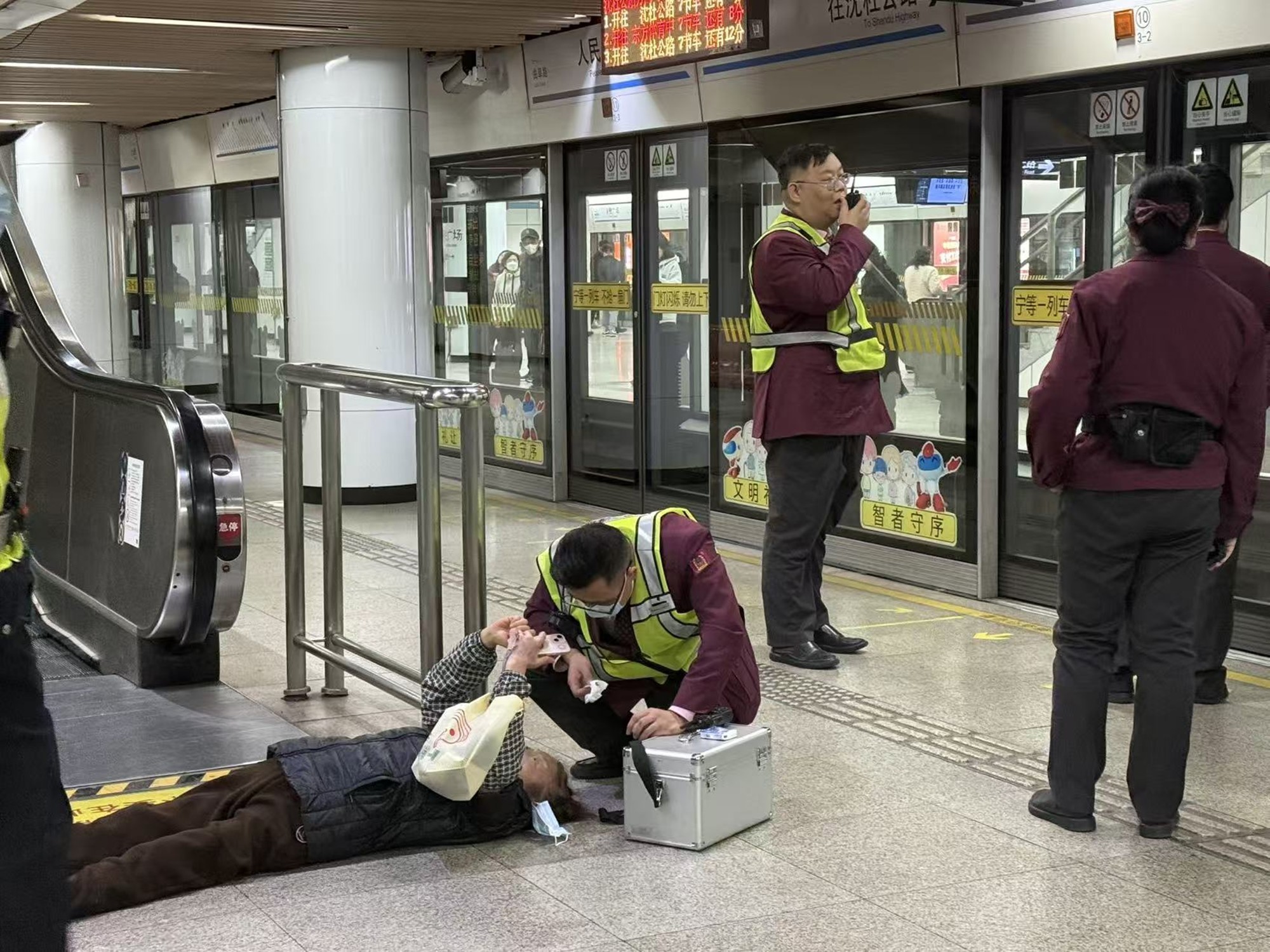 危险!地铁站自动扶梯上有人摔倒!