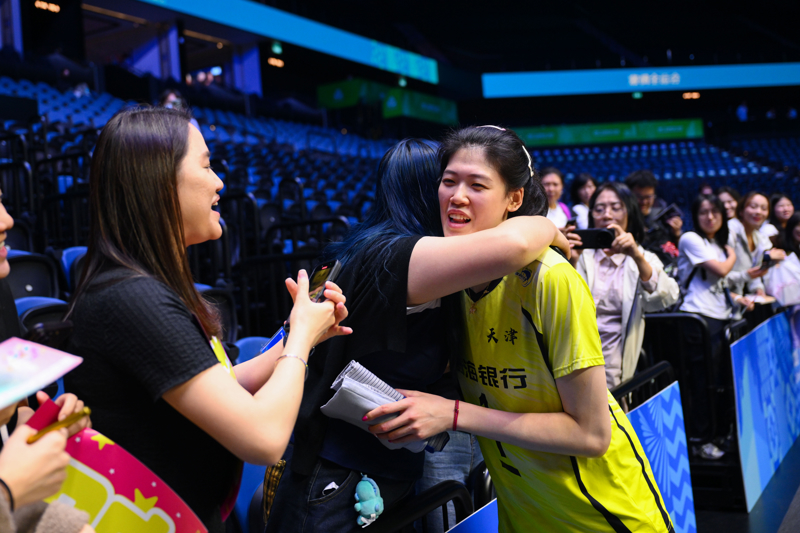 11月18日,天津队球员李盈莹(前右)在赛后与球迷互动。