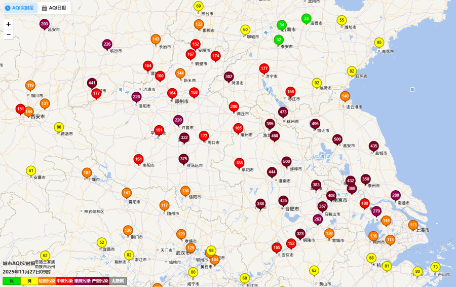 11月27日9时,全国部分地区城市实时空气质量指数,一个西北方向的污染输送通道已形成,已影响长三角地区。来源:全国城市空气质量实时发布平台