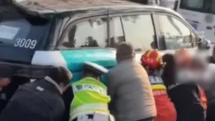 事发现场周边热心市民抬车救人。目击者称,事发地在斑马线处,疑是两人过马路时被撞倒。