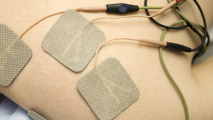 电疗师将两片电极板放置在患者臀部,自己则光脚踩在另一片电极板上,患者皮肤受到电击后出现了局部痉挛现象。这位电疗师说,这种疗法可以治愈40多种病症。