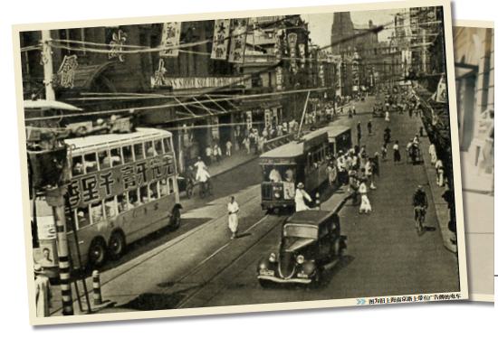 图为旧上海南京路上带有广告牌的电车