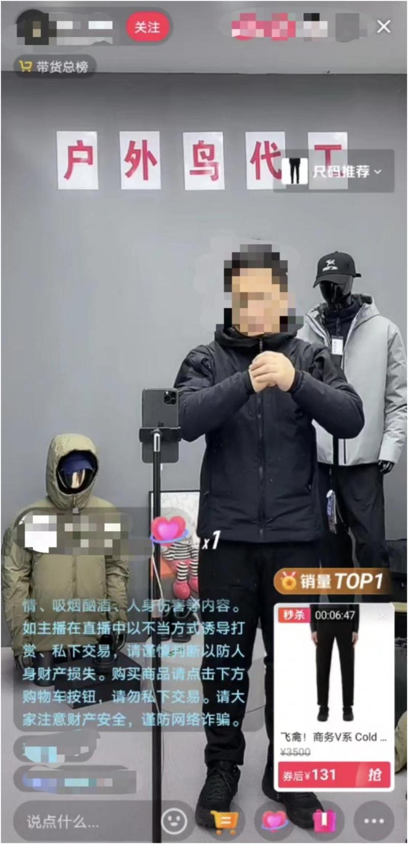 12月7日上午10点左右,红星资本局观察到,有不下15家自称卖“始祖鸟代工货”的直播间同时播送卖货。他们不会明显地标注自己是始祖鸟代工厂,产品也没有始祖鸟的LOGO,但主播会在被问起时回答“是‘鸟’的代工厂”,产品名称会隐晦写上“鸟”“骨鸟”“飞禽”等字样。这些直播间卖的款式是始祖鸟原版价格的十分之一、二十分之一。