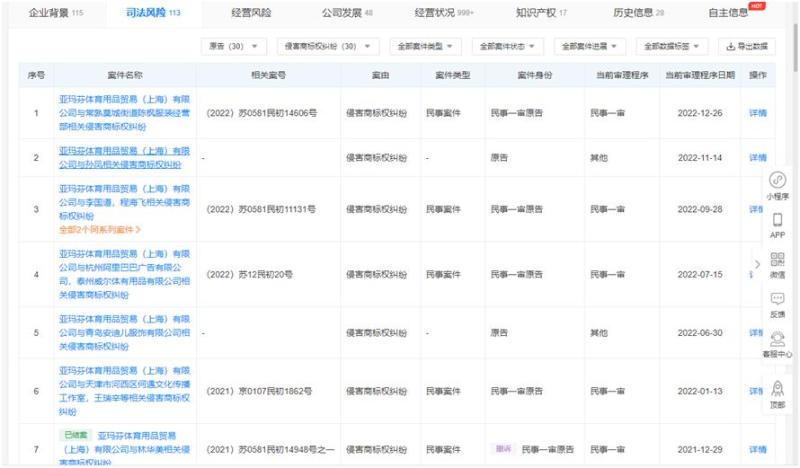 天眼查显示,始祖鸟中国官方服务号的微信公众号主体“亚玛芬体育用品贸易(上海)有限公司”目前已是30起侵害商标权纠纷案的原告。
