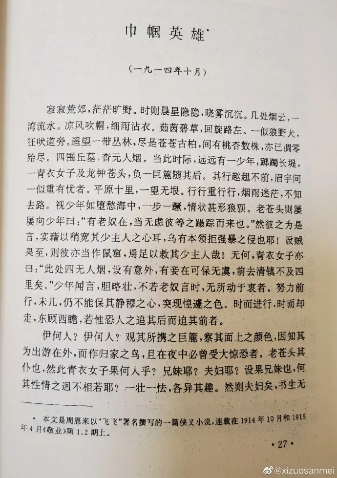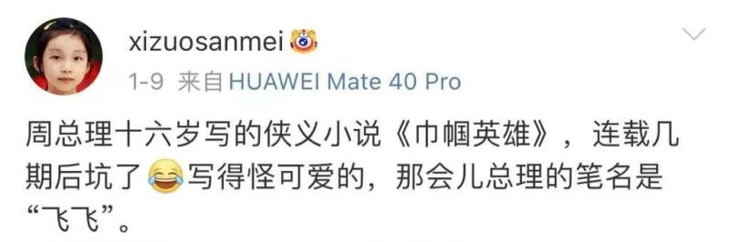 2022年1月,一本名为《巾帼英雄》的武侠小说走红。这本小说刊载于1914年,但被作者“弃坑”,没有完结。而小说走红的原因在于,这位“弃坑”的作者“飞飞”正是周恩来,这本小说是他16岁时的作品。