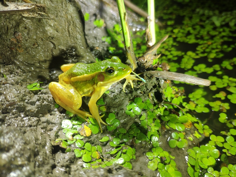 金线侧褶蛙,摄于张马村栖息地,为上海优势蛙种,适应性强、分布广,成体体长可达5厘米至7厘米,身体多绿色,两侧各有一道较宽的黄色褶线 谢汉宾 摄