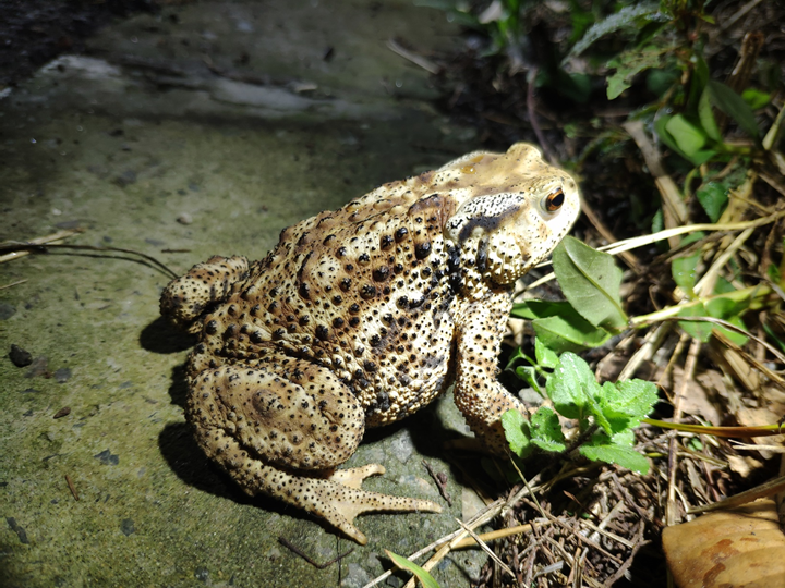 中华大蟾蜍,俗名癞蛤蟆,皮肤较干燥、粗糙,背部疙瘩是它的毒腺,受大力挤压后破裂流出毒液 谢汉宾 摄