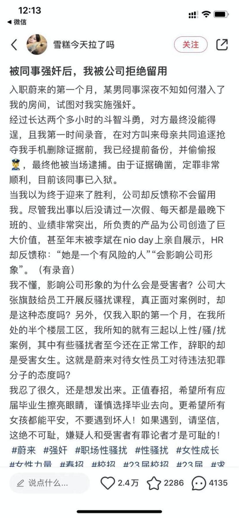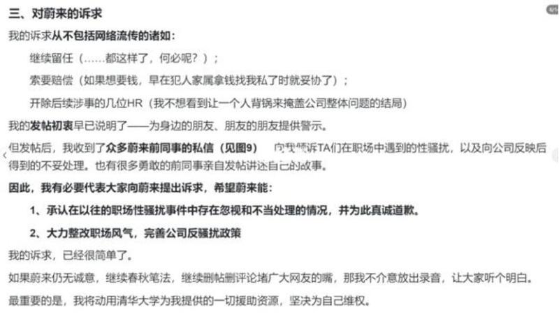 “雪糕”还透露:“仅我入职的第一个月,在我所处的半个楼层公区,就有三起以上性骚扰案例,有些骚扰者至今还在正常工作,辞职的却是受害女生,这就是蔚来对待女性员工和犯罪分子的态度吗?”