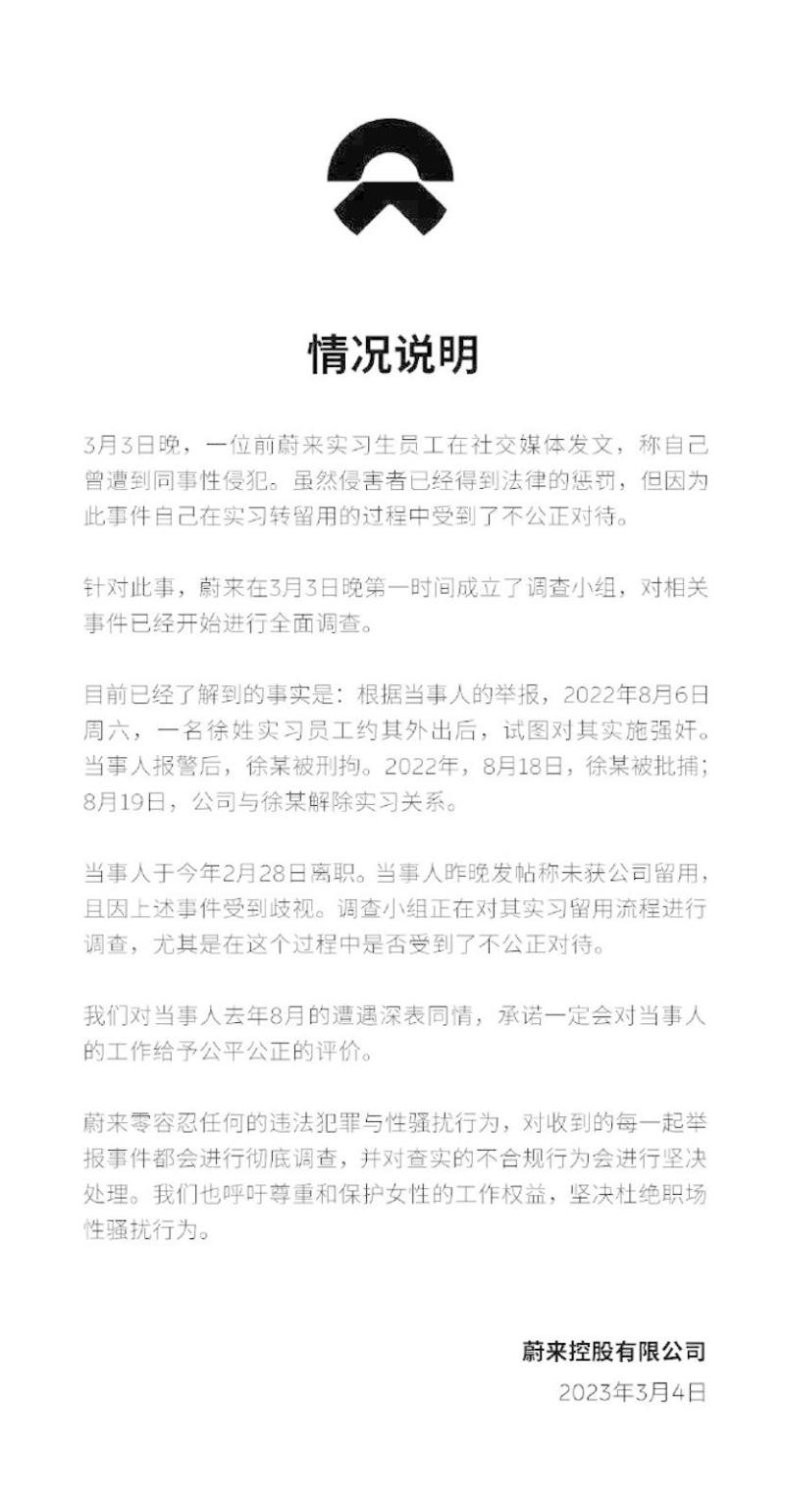 面对网友们的质疑,3月4日,蔚来在其官方微博发布《情况说明》称,该公司已于3月3日晚第一时间成立调查小组,正在对当事人实习留用流程进行调查,尤其是在这个过程中是否受到了不公正对待,承诺会对当事人的工作给予公平公正的评价。