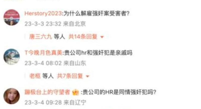 该帖一经发出,就迅速引发舆论广泛关注,网友也是一边倒地对受害女子进行声援——“为什么解雇强奸案受害者”“贵公司HR和强奸犯是亲戚吗”“有这么欺负人的吗”……