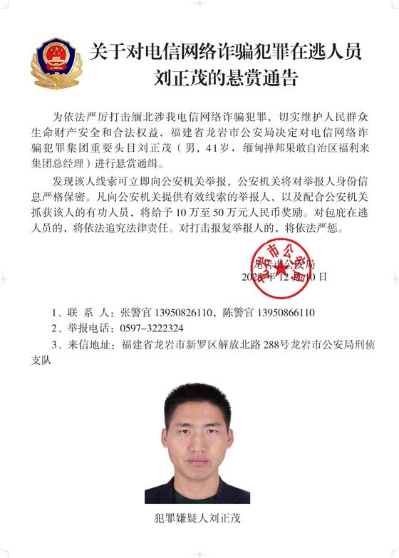 为依法严厉打击缅北涉我电信网络诈骗犯罪,切实维护人民群众生命财产安全和合法权益,辽宁省大连市公安局决定对白所成、白应苍(又名李云晨)、白应兰(又名李梦娜)进行公开悬赏通缉;福建省泉州市公安局决定对魏怀仁、魏榕(又名陈榕)、魏青松(又名杨松)进行公开悬赏通缉;福建省龙岩市公安局决定对刘正祥、刘积光(又名李华光)、刘正茂进行公开悬赏通缉;重庆市公安局决定对徐老发(又名徐发启)进行公开悬赏通缉。