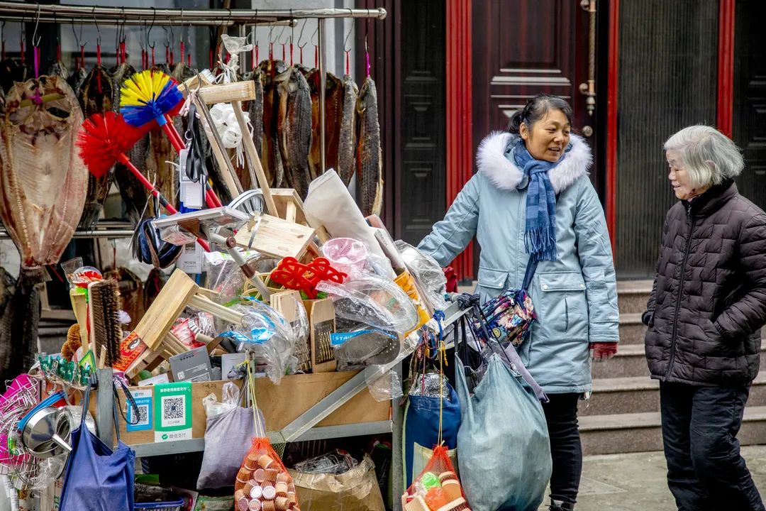 当记者在梁弄菜市场路口和陈慧一起摆摊闲聊时,几乎每隔不到十分钟就会被打断,热水瓶塞、苍蝇拍、打火机、塑料绳、牙签、袜子、剪刀……小镇的清晨属于挎着菜篮的居民,无论买与不买,都会在陈慧的小车前停下来寒暄几句。