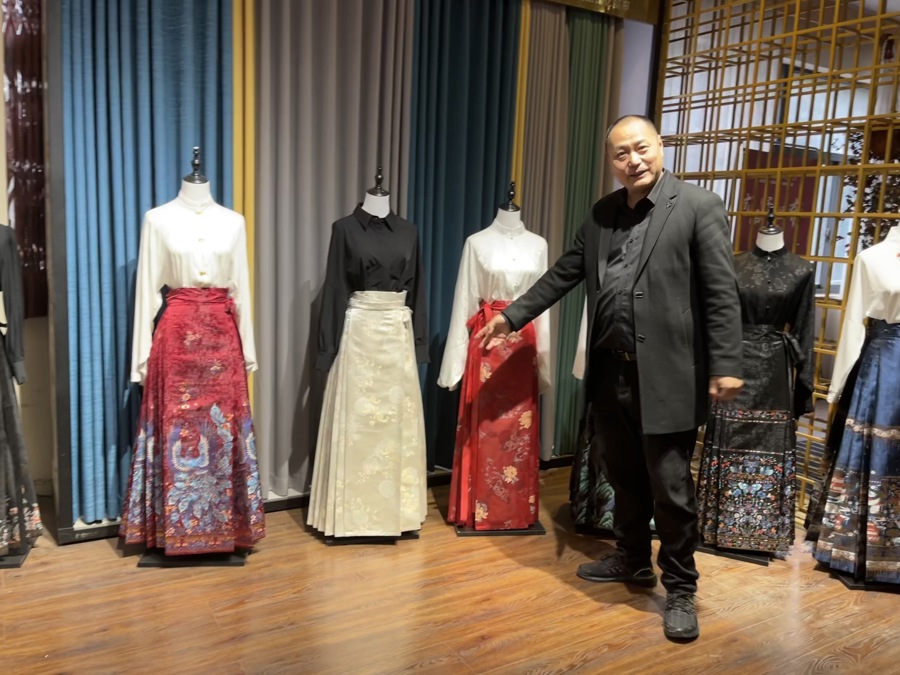 张明强向记者介绍他研发的宋锦马面裙。刘畅 摄