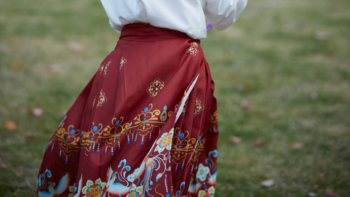 随手点开一个汉服直播间,主播正卖力地推销着大红色马面裙,裙摆上的玄鸟、祥云图案是卖点之一。临近春节,大红色的马面裙款式销量尤其好,很多尺码刚上架就一售而空。