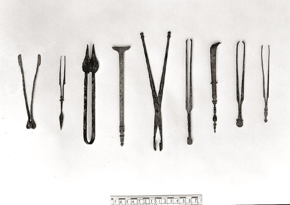 除了日常美白与保护,牙齿出问题时仍需要牙医协助。罗马北部近邻伊图里亚很早就有高超的牙科技术,罗马城也可能因此受到影响。罗马第一部成文法《十二铜表法》中就有规定,尸体不准穿戴金器,除非是用金线或金片进行的手术搭桥,“把牙齿用金子捆了起来”(西塞罗《论法律》)。尽管牙科技术高超,牙医在古代却并不常见。铭文材料中,牙医的墓碑留存很少,意大利著名考古学家鲁道夫·兰齐阿尼(Rodolfo Lanciani)在1893年记录下了两块罗马城外的墓碑,上面刻画有牙医的拔牙钳。同样在罗马,卡斯托尔和波吕克斯神庙最北端的商铺中出土了86颗病牙,牙根完整,手法专业,这一商铺可能曾是专业牙科诊所。