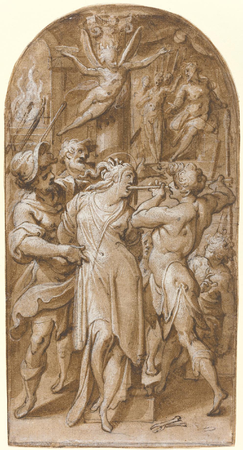雅各布·祖基(Jacopo Zucchi)《圣阿波罗尼娅殉道》,阿波罗尼娅为公元2世纪罗马著名圣徒,在亚历山大里亚被害,受到的折磨中,最著名的便是被拔光了所有牙齿。