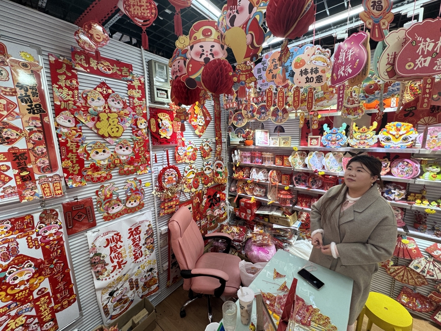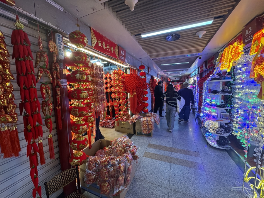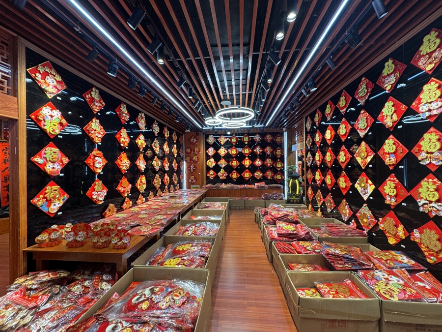 新年伊始,义乌国际商贸城一区三楼节庆用品区“年味”十足:从大红的灯笼到烫金的福字挂饰,从写着吉祥话的春联到设计别致的新年红包。走在市场里,目之所及皆是一片火红。虽然蛇年新春已经近在眼前,但是若论现时现刻“年味”的浓度,即便放眼整个义乌,恐怕也难找出第二个地方。