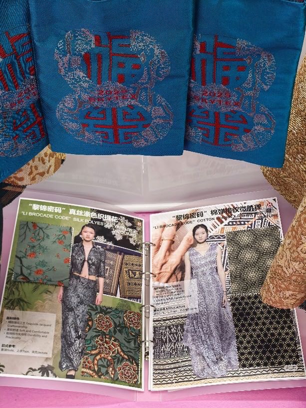 法国PV展是面向全球纺织专业人士开放的顶级纺织面料博览会,也是全球最具权威和最新面料流行趋势发布的风向标。此次展出的黎锦提花系列面料,将海南黎族传统葫芦图腾解构为纹样骨架,通过精密提花工艺模拟蛇鳞的层叠质感,青绿色渐变底色象征热带雨林的生机,点睛之笔的朱砂红“福”字则暗合“见福得福”的文化隐喻。现场观众惊叹于面料中传统符号与现代美学的平衡,一位意大利买手赞叹:“东方传统文化与科技感的碰撞,重新定义了奢侈面料的可能性。”