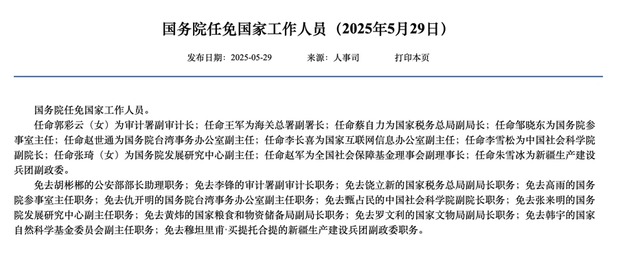 任命郭彩云(女)为审计署副审计长;任命王军为海关总署副署长;任命蔡自力为国家税务总局副局长;任命邹晓东为国务院参事室主任;任命赵世通为国务院台湾事务办公室副主任;任命李长喜为国家互联网信息办公室副主任;任命李雪松为中国社会科学院副院长;任命张琦(女)为国务院发展研究中心副主任;任命赵军为全国社会保障基金理事会副理事长;任命朱雪冰为新疆生产建设兵团副政委。