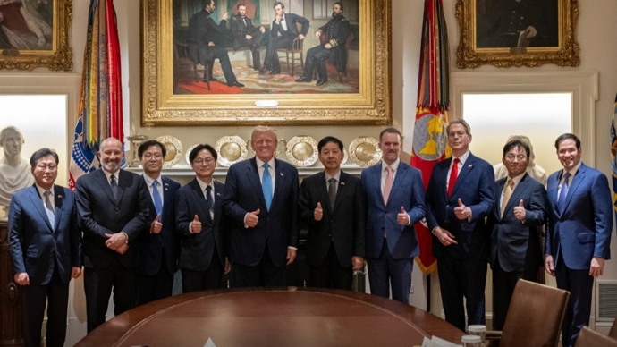 当地时间7月30日,特朗普在白宫内阁会议室会见由韩国副总理兼企划财政部长官具润哲领衔的韩国政府谈判团成员,时长约30分钟。